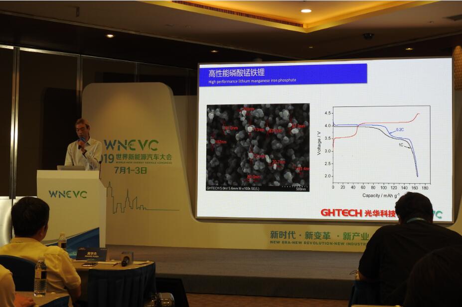 在今天下午舉行的2019世界新能源汽車大會“動力電池技術創新與安全”主題峰會上,光華科技向與會各方進行了“以創新思維重塑動力電池價值鏈”的主題報告,首次對外發布即將上市的新產品——磷酸錳鐵鋰!