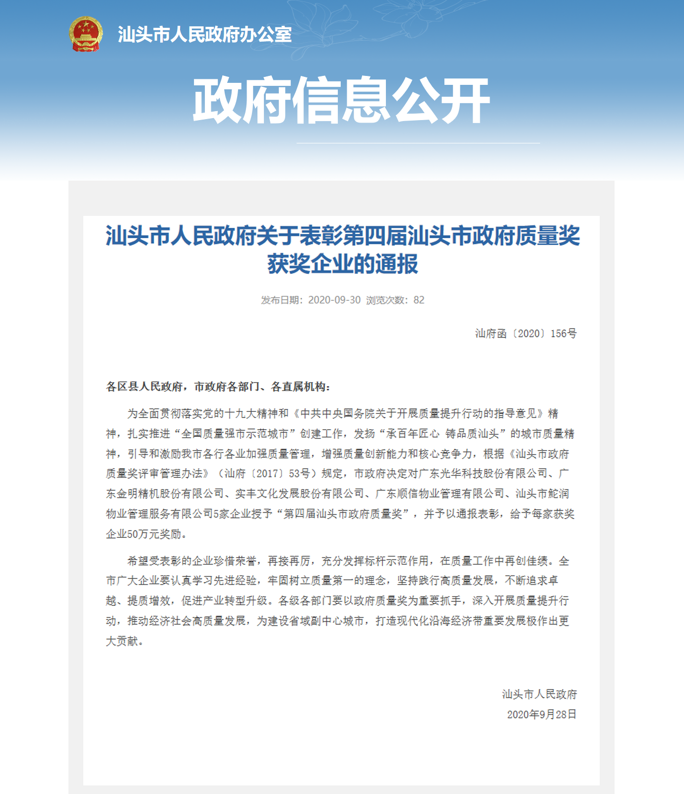 汕頭市政府質量獎是汕頭市人民政府設立的最高質量獎項,主要參照全國質量獎評獎標準GB/T19580《卓越績效評價準則》,每兩年評選一屆,堅持“高標準、嚴要求、好中選優”的評審原則,選出對質量管理成效顯著,產品、服務和經營質量、自主創新能力和市場競爭力等同行業內處于領先地位,以及對地方經濟社會發展作出卓越貢獻的企業。每屆獲獎企業或組織數量不多于五家。此獎項對樹立行業標桿企業,激勵各行各業提質增效,對社會經濟高質發展具有極大推動作用。