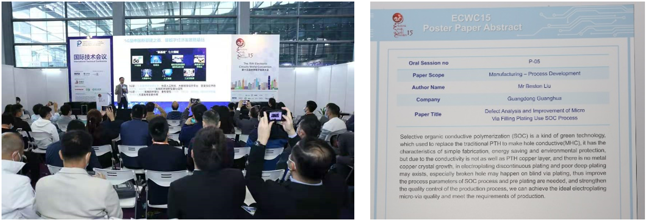 2020國際電子電路(深圳)展覽會不僅展示范圍豐富,更致力于通過行業分享和趨勢解讀幫助業內人士開拓視野,啟迪思維,舉辦多場高水準創新論壇,增強展會軟實力。同期舉行的第十五屆世界電子電路大會(ECWC15) 會議,匯聚了全球業界領袖及專家學者議題全面覆蓋市場及技術發展。光華科技技術中心副總經理劉彬云先生論文入選,與參會者對PCB熱點技術及市場發展的真知灼見,探討電子電路領域熱門議題、最新技術發展和趨勢,助參會者一起把握行業最新資訊,洞見未來。