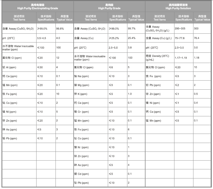 It is the major copper compounds of acid copper plating and electroless copper plating ; it is also the Cu2+  source of plating solution, which is widely used in fields of hardware, plastic, PCB, electronic components and electroless plating etc.