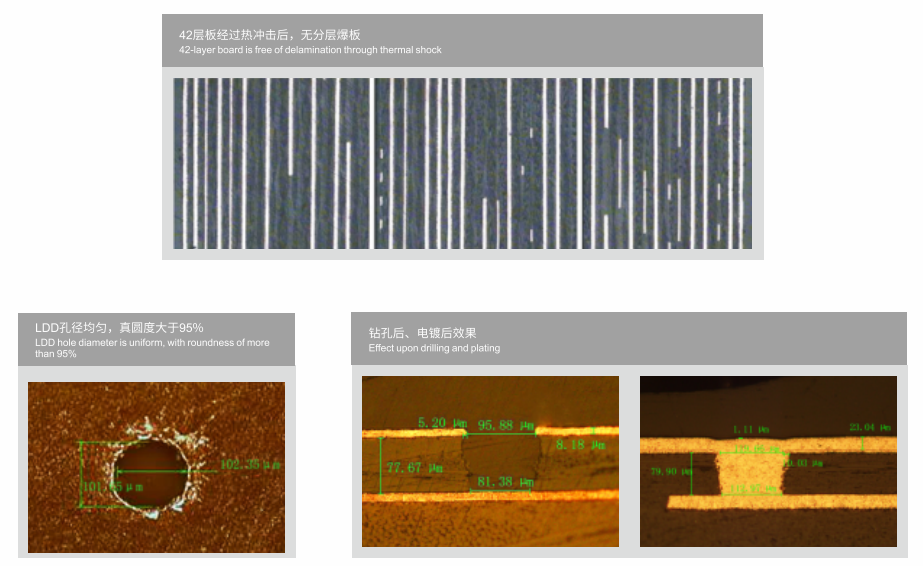 棕化是銅面在微蝕反應中,緩蝕添加劑會選擇性吸附在銅表面,從而在銅表面形成均勻的蜂窩狀微觀結構,增加比表面積,使壓后銅面與樹脂材料有良好的結合力。經過LDD棕化處理后形成的銅表面及均勻的蜂窩狀結構,有利于吸收激光能量,能應用于激光鉆孔前處理。